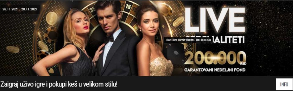 Live specijaliteti predstavljaju dva turnira nedeljno sa lajv dilerima, a najbolji igrač će biti bogatiji za 200.000 dinara, dok će najboljih 10 igrača podeliti 100.000 dinara u kešu, a ova promocija važi za sve igre provajdera Evolution.